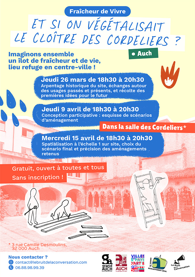 Le jeudi 26 mars à 18h30 à la salle des Cordeliers, la ville d’Auch vous invite à participer à un premier atelier collectif sur la création d’un îlot de fraîcheur au cœur du Couvent des Cordeliers.
