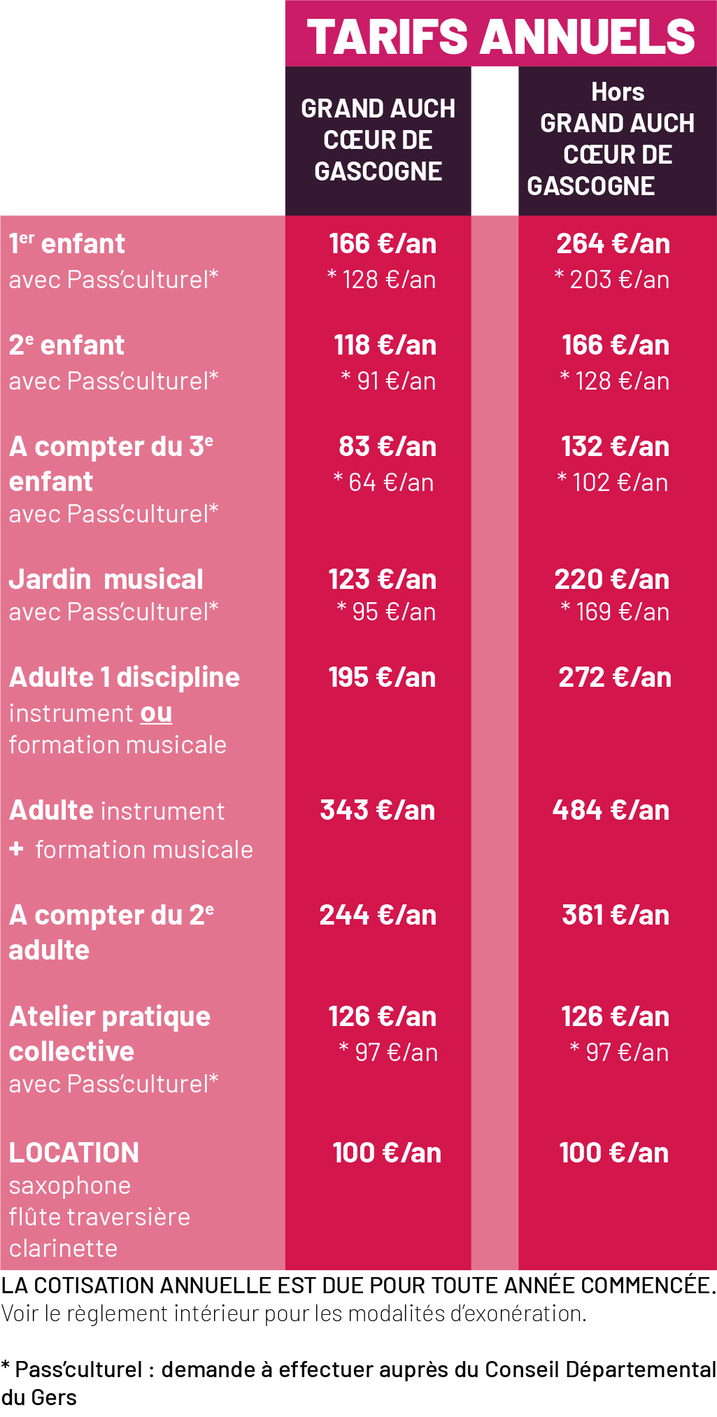 Du classique à la musique actuelle en passant par les ateliers de chant choral enfant, de jazz ou les différents ensembles de classes, l’Ecole de Musique de Grand Auch Cœur de Gascogne propose un enseignement musical adapté à tous les âges et tous les niveaux, à des tarifs accessibles au plus grand nombre, avec la possibilité de prêt gratuit d’instrument.